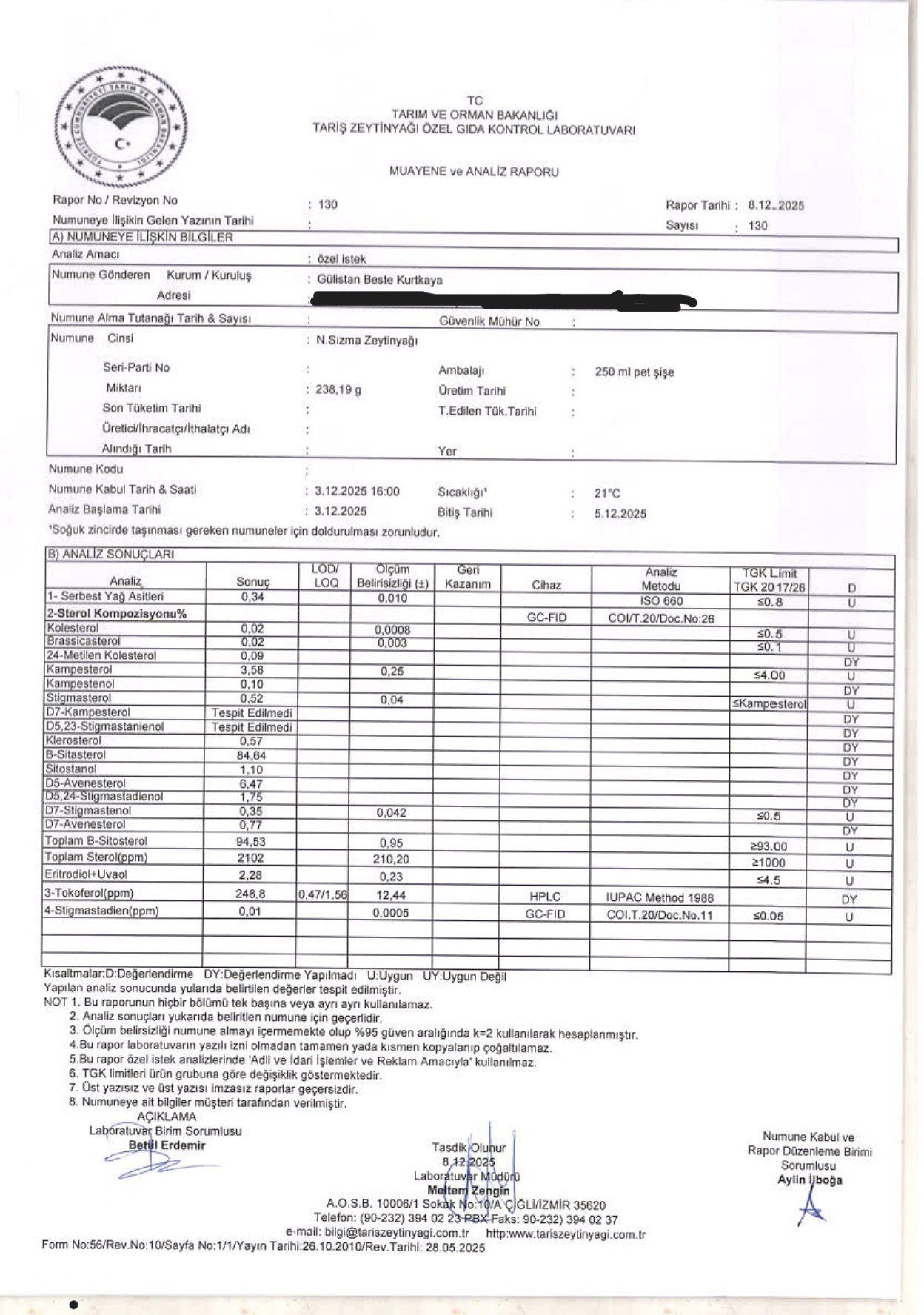 Lavinya Natürel Sızma Zeytinyağı – Analiz Sonuçları